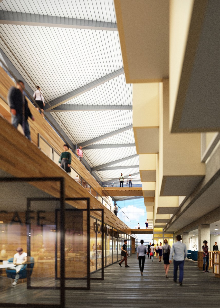 The Forum will be a new interior space connecting Library North and Library South. This new space is a hub for activity, connection and function. As opposed to the empty and formal space of a traditional atrium, this Forum is a radically informal space for students, with a terraced stair as the centerpiece. Providing additional reader space at the very center of the Library, it is not just an expressway for movement and a place to sit, but it is packed with adaptable space that can accommodate many needs. A community room, an experimental classroom, an exhibit space, and additional meeting rooms are featured here. The proposed roof structure reaches over both buildings to capture diffused natural light from the north and south.
