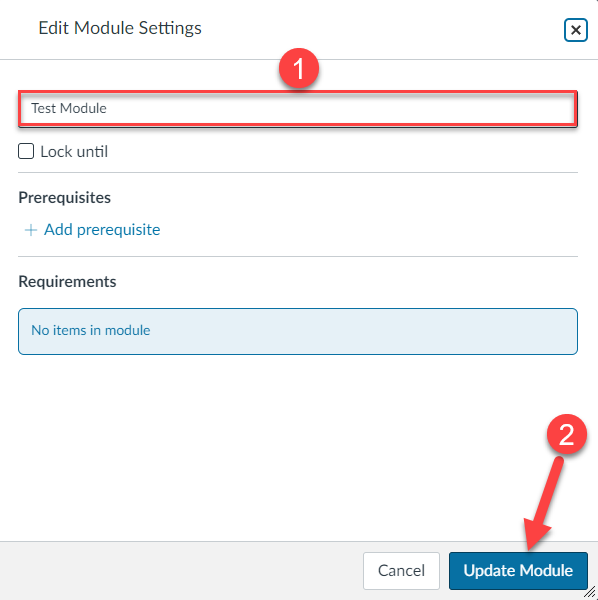 When you set up prerequisite modules, students must complete a module before moving to the next module. When you add requirements to a module, students must complete the defined requirements within the module before the module will be marked complete. You can require students to complete all requirements in the module, or have them choose one item to fulfill a specific requirement.